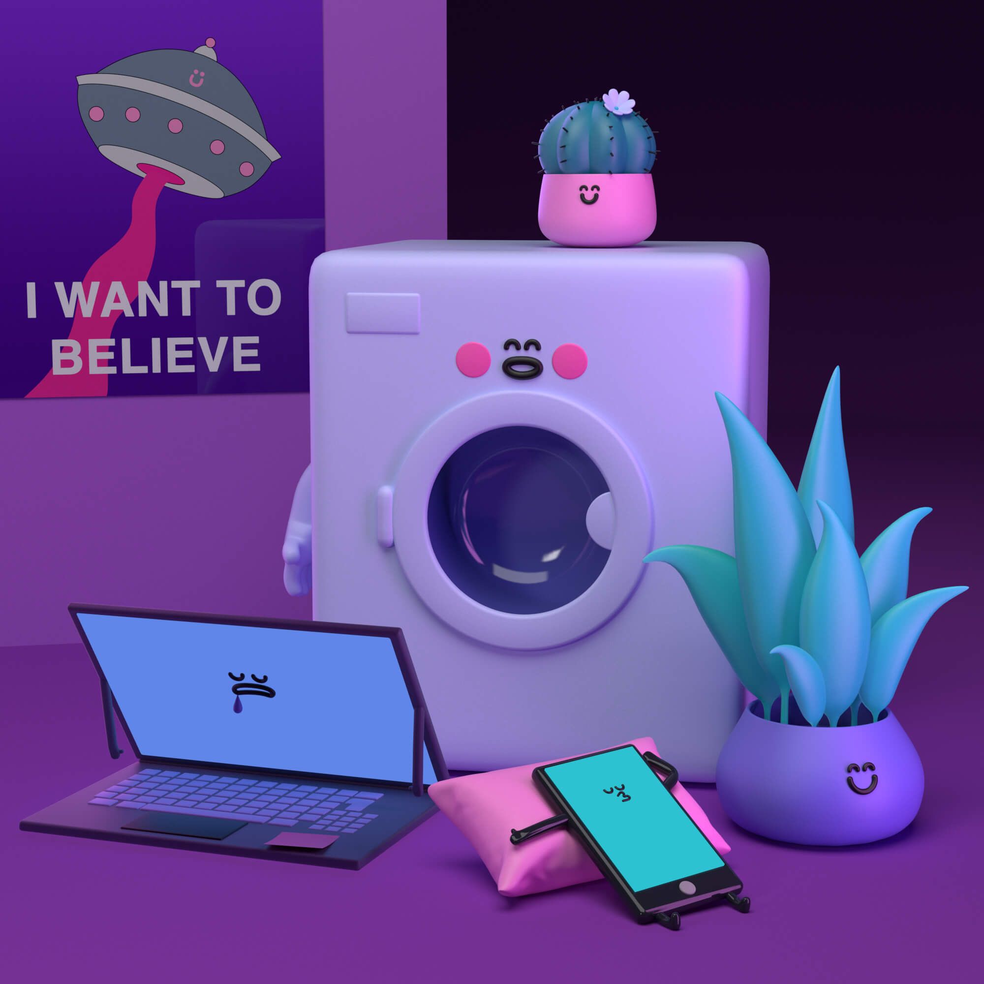 I spent the last winter lockdown rewatching all of the x-files. Therefore, the idea of a classic alien abduction seemed obvious. However, all of the characters needed to be in the same spot to be in the same spot to close the animation loop in order for them to be actually abducted. This is the reason I got the idea to have the washing machine open as well as the single pink sock flying up to the UFO.